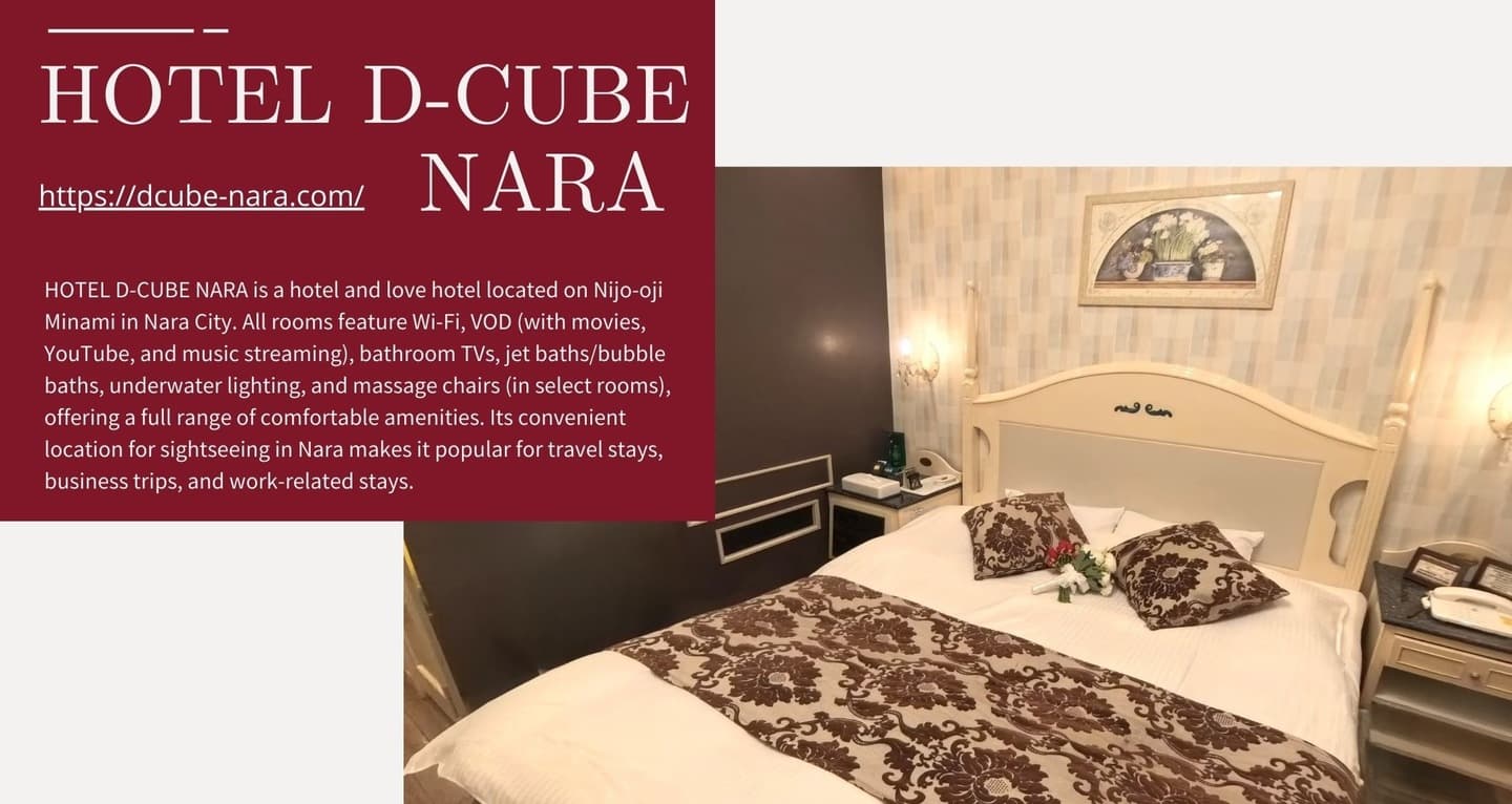 HOTEL D-CUBE 奈良店は、奈良市二条大路南にあるホテル・ラブホテルです。全室 Wi-Fi完備、VOD(映画・YouTube・音楽視聴対応)、浴室TV、ジェットバス・バブルバス、水中照明、マッサージチェア(一部ルーム)など快適な設備が充実しています。